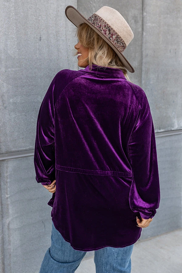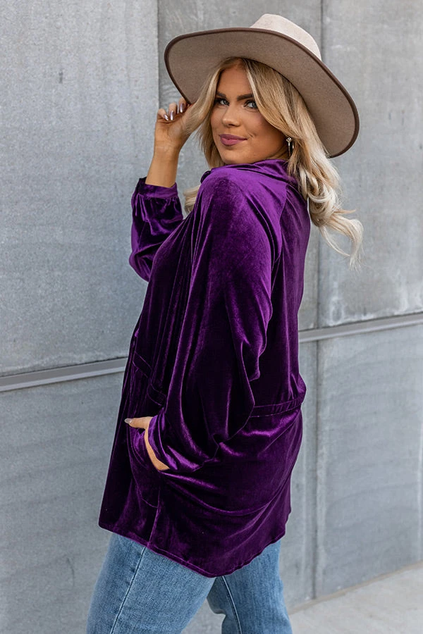 Fall is in the air! Layer up in luxury with our ‘Apple Cider Sips’ velvet jacket featuring soft, lightweight purple colored velvet, collar, button up closure, two large side pockets, long loose sleeves with button cuffs, and a loose fit that falls to a rounded front hemline.
