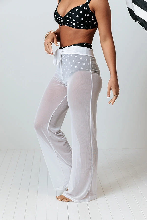 Keep cool all summer long in our chic white ‘Away On A Yacht’ cover up pants featuring ultra lightweight mesh material, a tie closure waistline, and a flattering form fitting silhouette that ends in straight floor-length hemlines! These pants can comfortably fit up to a size 12.
