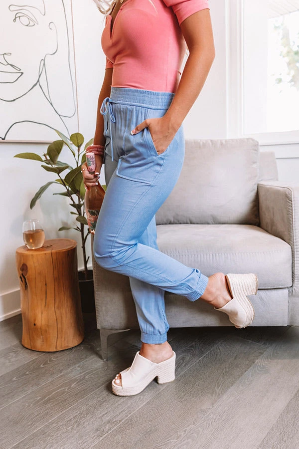 Add a simple but sophisticated finish to your OOTD with our upscale blue ‘Broadcasting Live’ joggers featuring lightweight flowy material, a high elastic waistline with a tie belt, accent side pockets, and a slouched pants silhouette that tapers into fitted ankle-length hemlines!