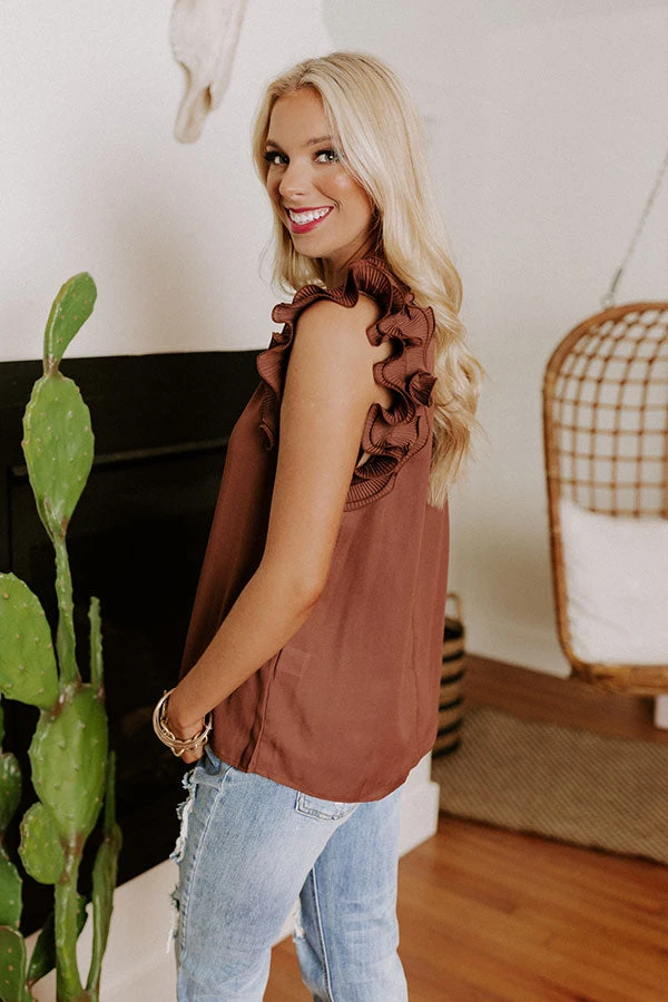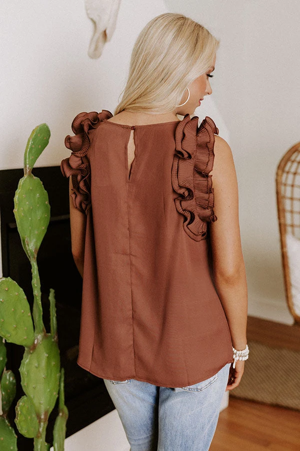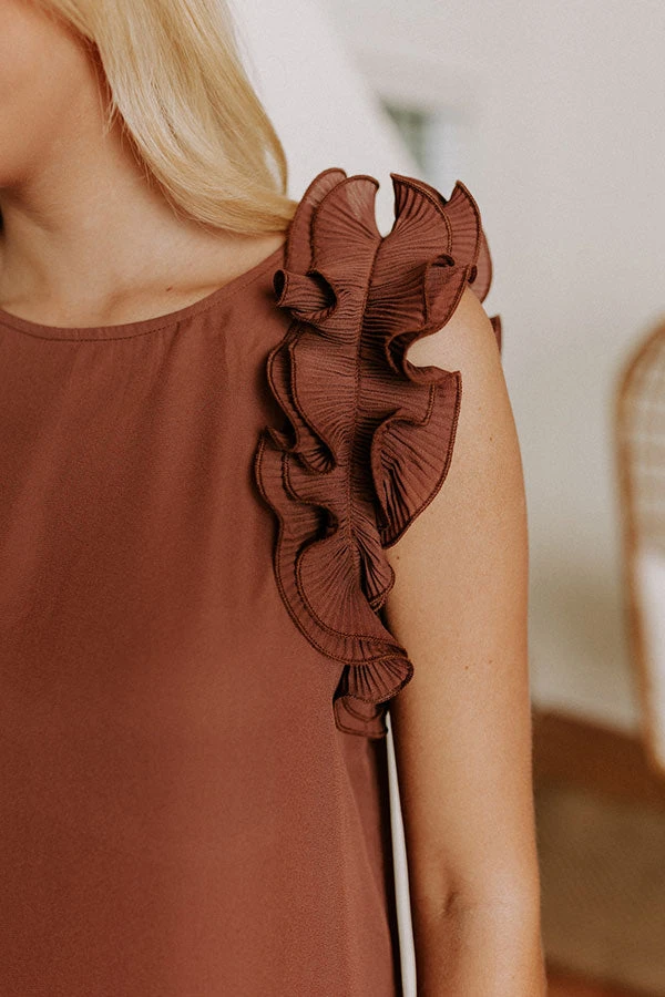 People are sure to cheer on you amazing style when you complete your look with this cute chocolate colored shift top featuring lightweight material, a rounded neckline, ruffled cap sleeves, a keyhole accented upper back with a button closure, and a relaxed silhouette that falls into a straight hemline!