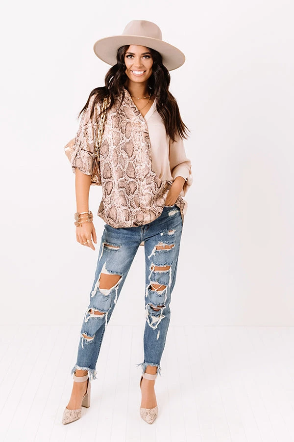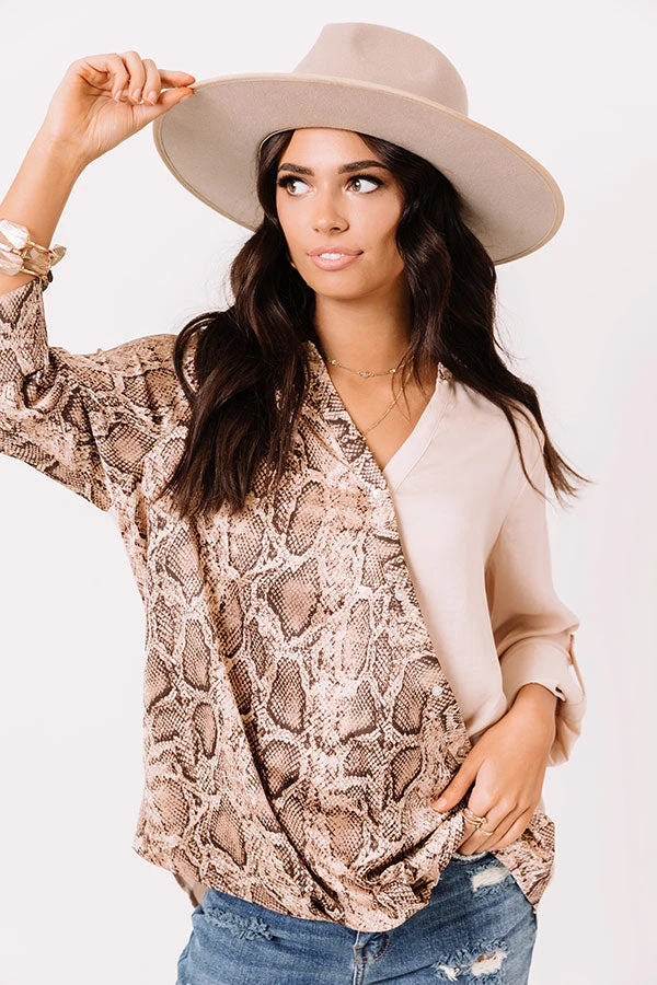 Keep it cool in this trendy shift top featuring soft lightweight material, a faux wrap bodice patterned with a brown hued snake print on one side and a solid neutral hue on the other, long loose roll tab sleeves, a high v-cut neckline, and a slouched silhouette that falls into a rounded hemline!