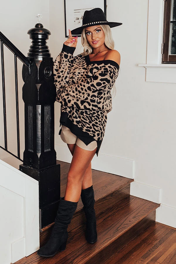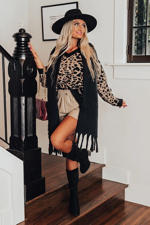 You are sure to catch a cozy reputation when you complete your look with this adorable natural hued sweater featuring a black leopard print, a v-cut neckline, black accent trim, long loose sleeves, and a slouched silhouette that falls into a straight hemline with side slits!
