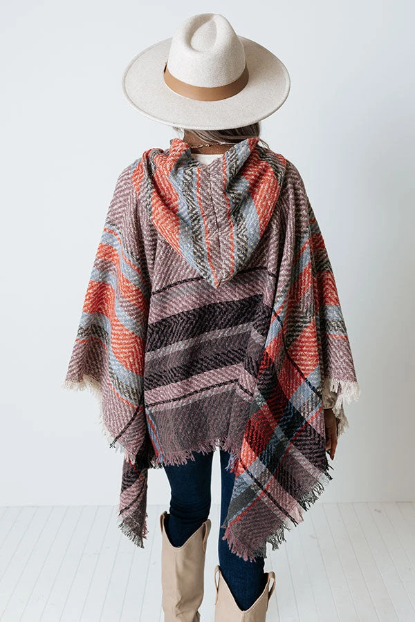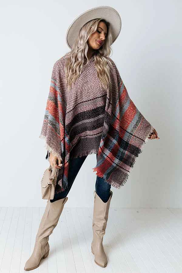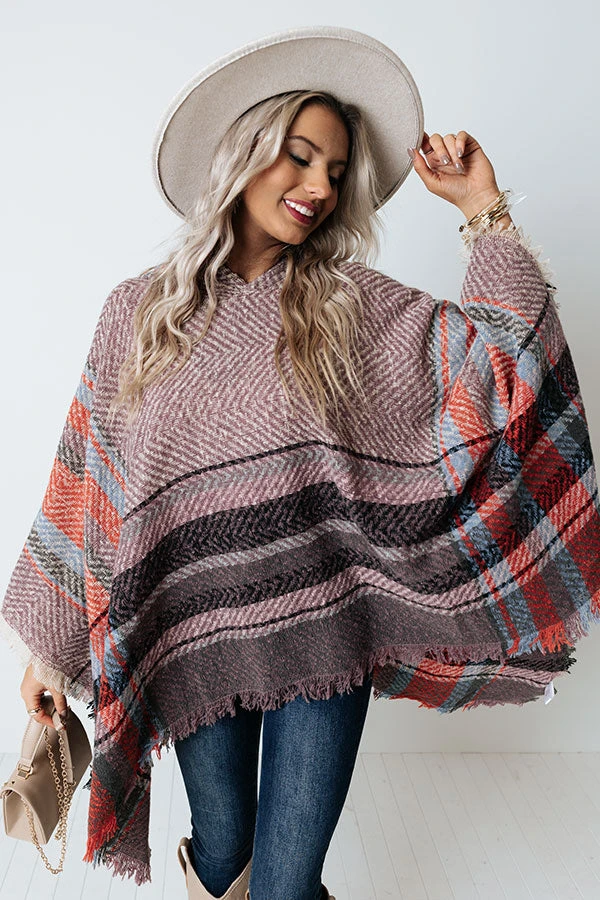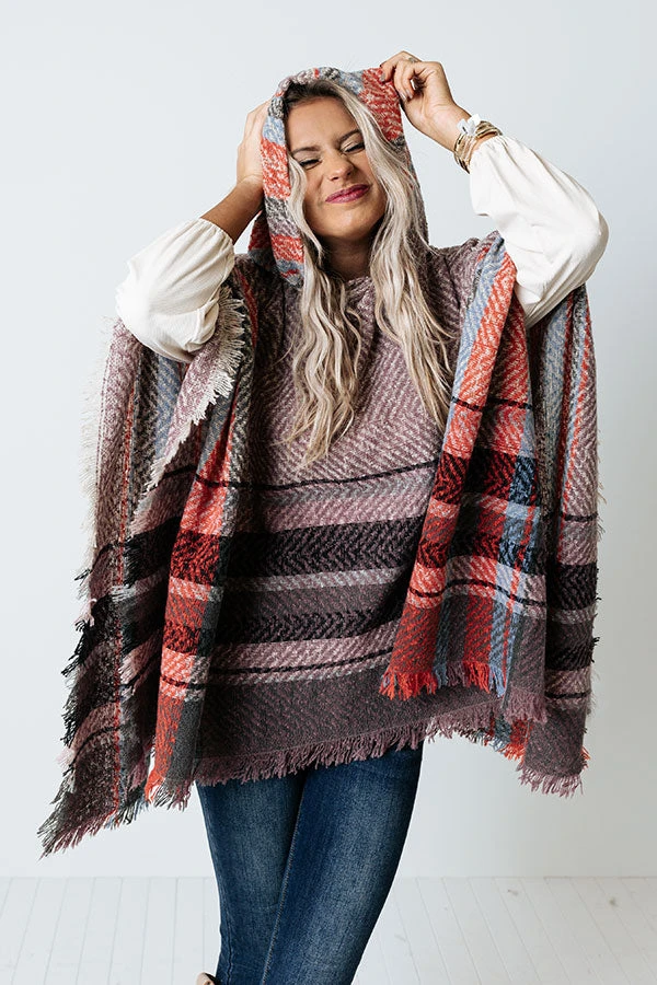 Cuddle down in this adorable heirloom lilac colored poncho featuring soft and warm knit material patterned with large black, rust, and blue hued stripes, a rounded neckline with a hooded back, open sides, and an ultra draped silhouette that falls into a straight mid-thigh length hemline with frayed trim detailing!