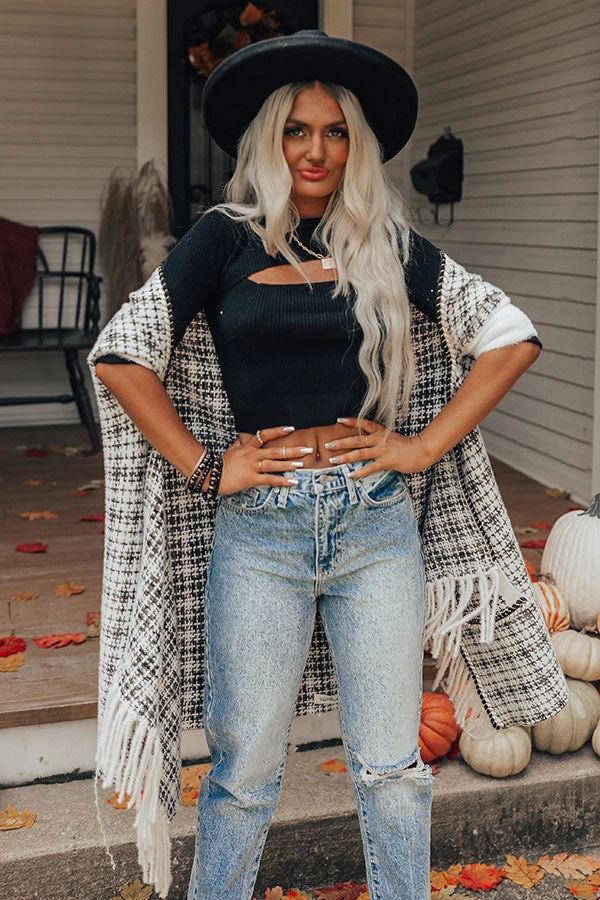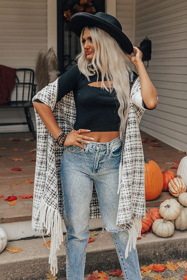 Enjoy this crisp weather on the daily in our Daily Affirmations Poncho. With its subtle knitted gold thread and fringe hem line you’re sure to make a fall statement! This poncho has ¾ sleeves and functioning pockets.