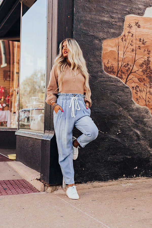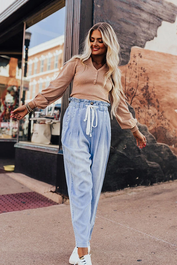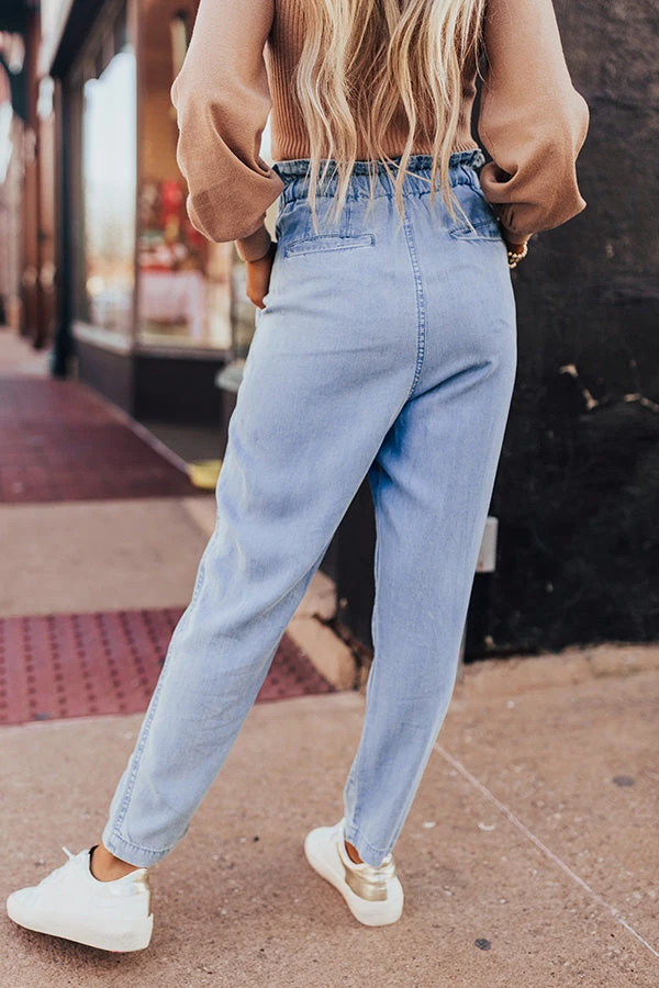 May all your dreams come true in these stylish pants featuring lightweight and flowy light wash chambray material with accent fading an subtle pleating around the hips, an elastic waistline with ruffled trim detailing and a tie belt closure, side pockets and two back pocket cuts, and a relaxed silhouette that tapers into ankle-length hemlines!
