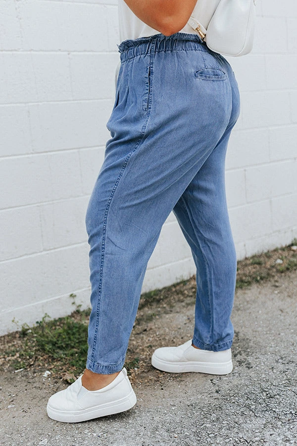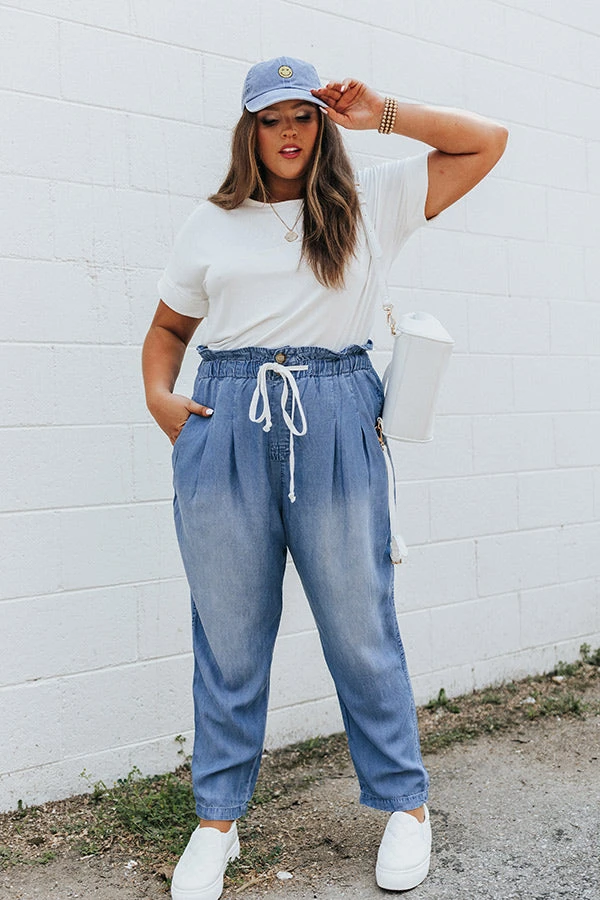 Plus Size – May all your dreams come true in these stylish pants featuring lightweight and flowy medium wash chambray material with accent fading an subtle pleating around the hips, an elastic waistline with ruffled trim detailing and a tie belt closure, side pockets and two back pocket cuts, and a relaxed silhouette that tapers into ankle-length hemlines!