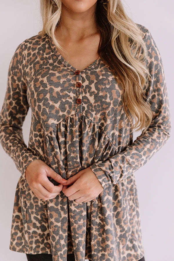 Dress like you are already famous with our adorable “Fame Game” top featuring soft lightweight material patterned with a bold brown and neutral hued leopard print, long semi-loose sleeves, a button up bodice with a v-cut neckline, and a relaxed babydoll silhouette that falls into an uneven tunic length hemline! We have styled this fierce transitional piece with some black flares and a neutral booties, faux suede hat, and tote, but you can also wear it with some distressed light wash ankle skinnies, “The Seraphina Faux Leather Wedge in Brown,” and our “Paris Posh Faux Suede Fan Earrings in Brown!”
