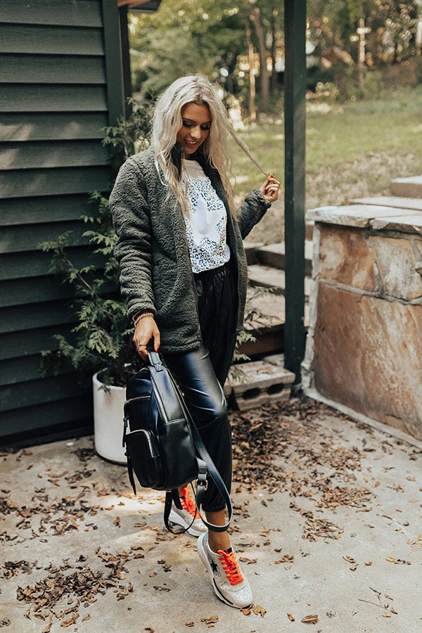 You are sure to have fond memories when you wear this cozy olive colored jacket featuring ultra soft sherpa material, long loose sleeves, a zip closure front with a collared neckline, accent side pockets, and a relaxed silhouette that ends in a straight hemline!