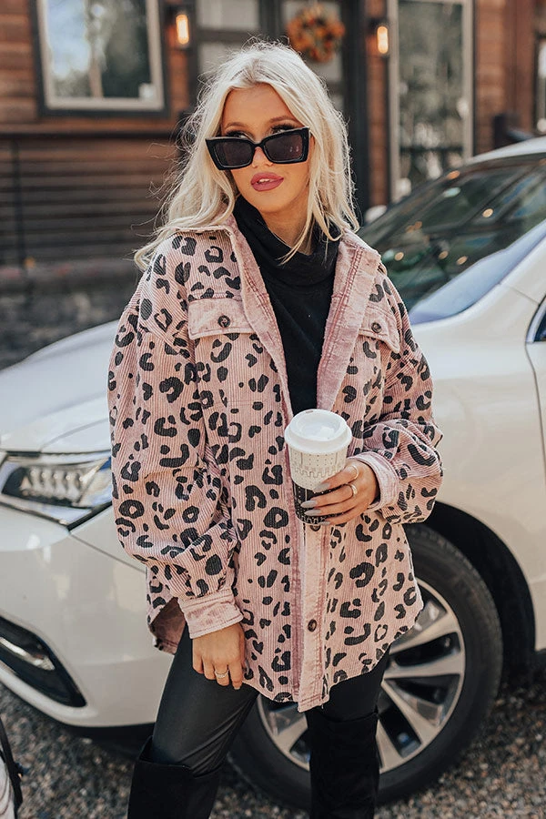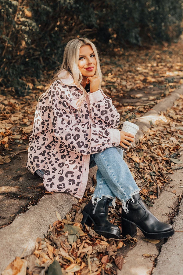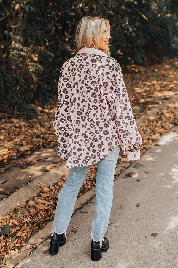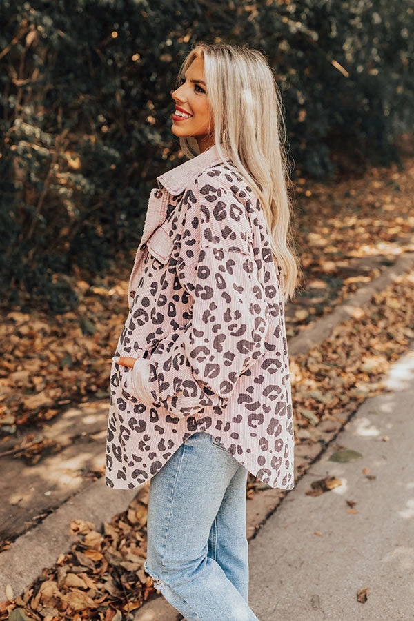 You will for sure have a good outfit day when you complete your look with this trendy blush colored jacket featuring corduroy material patterned with a black leopard print, a button down front with a collared neckline, long loose sleeves with button closure cuffs, two low pockets and two chest pockets with flap closures, and a relaxed silhouette that falls into a rounded hemline!