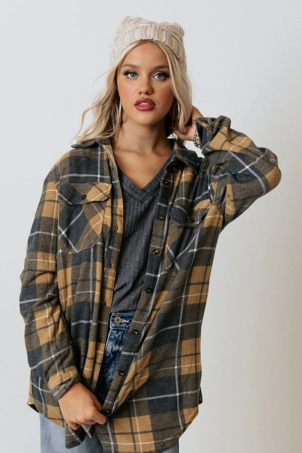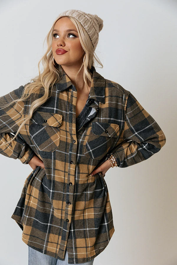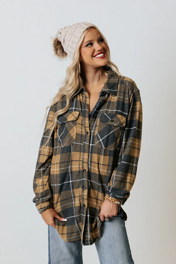 Fall is a great opportunity to wear this charming top with its lightweight material, mustard and navy hued plaid print, button down front with a collared neckline, long loose sleeves with button closure cuffs, two accent chest pockets with flap closures, and relaxed silhouette that falls into a rounded hemline!