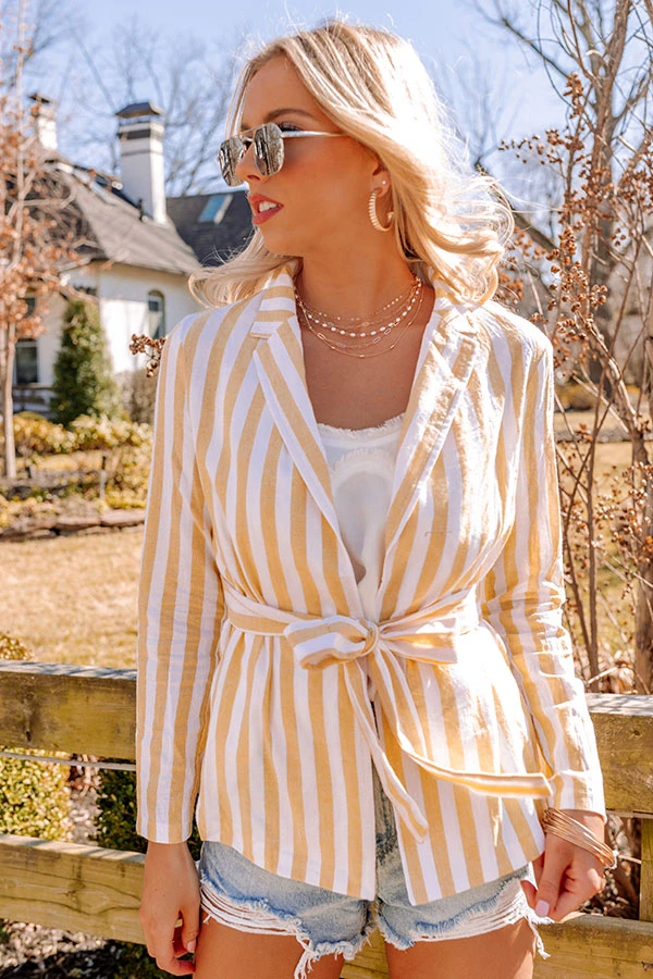 Channel your inner girl boss in our chic ‘Hamptons Forever’ blazer featuring lightweight material with vertical yellow and white accent stripes, long loose sleeves, a collared neckline, a matching tie closure at the waist, and a flattering silhouette that ends in a straight hemline!
