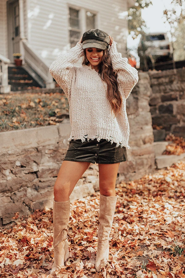 Stay warm and cozy while enjoying a “latte meet up” with the girls in this adorable ivory colored sweater featuring soft lightweight loose knit material with wide ribbed texturing, a high v-cut neckline that can be worn off one shoulder, long oversized sleeves, ultra distressed trim detailing, and a relaxed silhouette that falls into an uneven hemline!