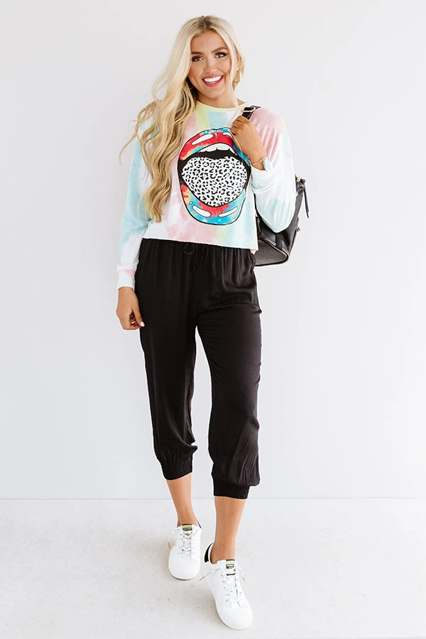People are sure to talk about how adorable this trendy sweatshirt is featuring ultra soft lightweight material patterned with pastel pink, blue, and yellow hued tie dye, a tie dye and leopard print mouth graphic on the front, a high rounded neckline, long loose sleeves with fitted cuffs, and a relaxed silhouette that falls into a straight cropped hemline! We have styled this eye-catching piece with some black joggers, matching sneakers, and a black faux leather backpack, but you can also wear it with some distressed denim shorts, “The Lyla Sandal in Red,” and our “Merlot Nights Hat in Black!”