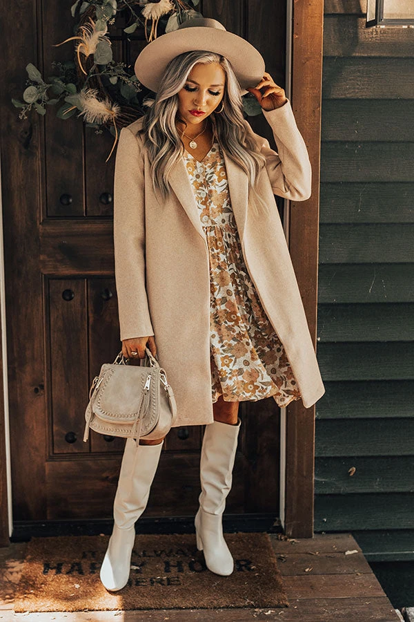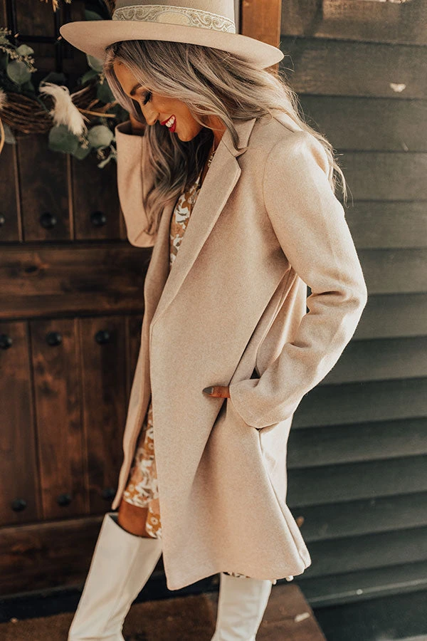 Cloak yourself in style all winger long with our luxurious rose quartz colored coat featuring a chic flap collared neckline, low accent side pockets, and an elegant open front silhouette that cascades into a straight knee-length hemline!