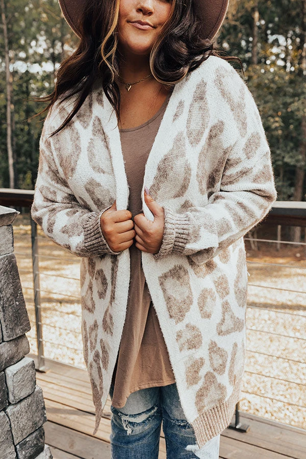 Chill out in this adorable plus size ivory hued cardigan featuring soft tight knit material patterned with a white and light natural hued leopard print, long loose sleeves, ribbed trim detailing, and a draped open front silhouette that falls into a straight mid-thigh length hemline!