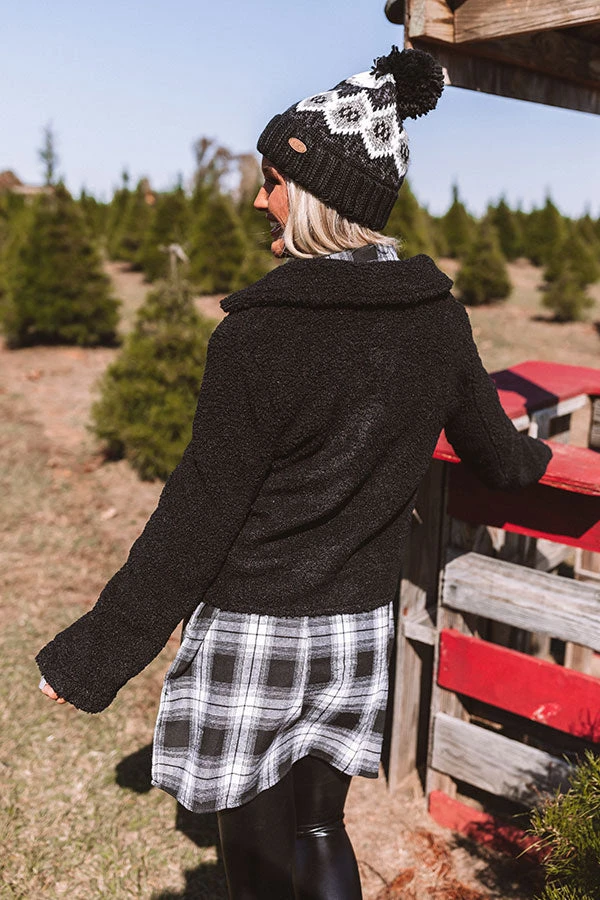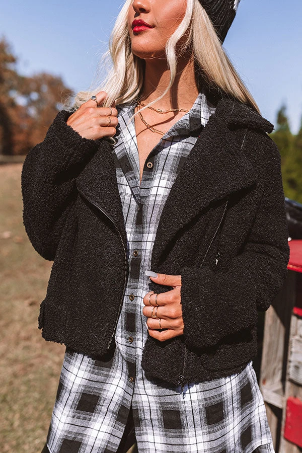 Upgrade your holiday street style game with our stunning black ‘NYC Wardrobe’ jacket featuring ultra soft and thick sherpa material, long loose sleeves, a diagonal zip front closure with a collared flap neckline, accent side pockets, and a flattering silhouette that ends in a straight hemline with accent snap closure straps!