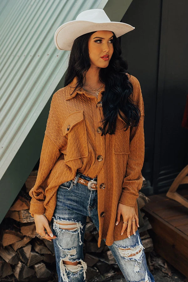 Fall is a breath of fresh, brisk air! Layer up and keep cozy in our sweet ‘Pumpkin Swirl’ jacket featuring lightweight camel colored cable knit material, collared neckline that goes into a button down front, two functional chest pockets, two additional side pockets, long relaxed sleeves with cuffs and button closure, and a relaxed silhouette that falls to a straight hemline.