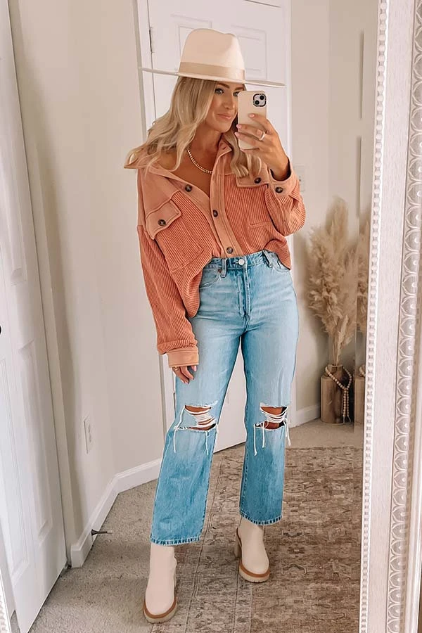 There is no better piece to wear on a fall road trip than this cute light orange jacket featuring lightweight material with textured panels, a button down front with a collared neckline, long loose sleeves, two accent chest pockets with flap closures, and a relaxed silhouette that ends in a straight hemline!