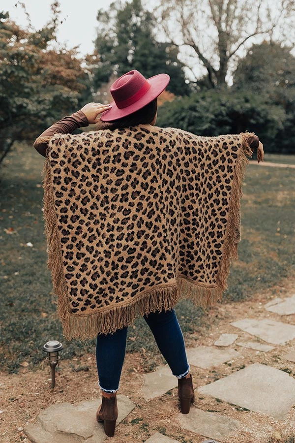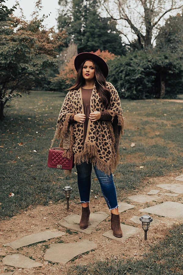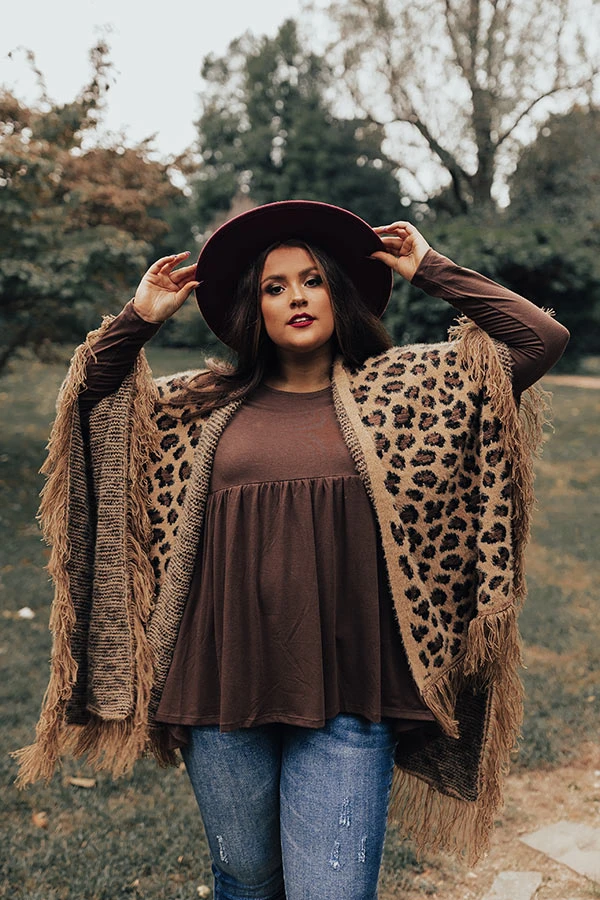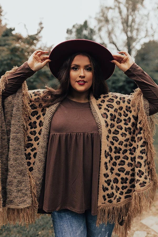 Elevate your holiday looks with our adorable plus size tan hued ‘Salted Caramel Latte Poncho’ featuring soft knit material patterned with a black and brown leopard print, open sides, fringe trim detailing, and an ultra draped open front silhouette that falls into a straight mid-thigh length hemline!