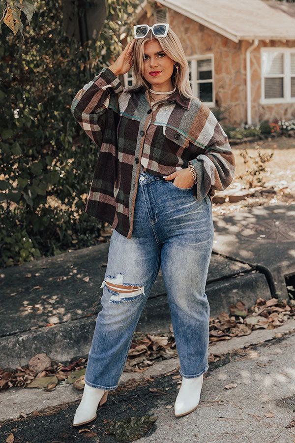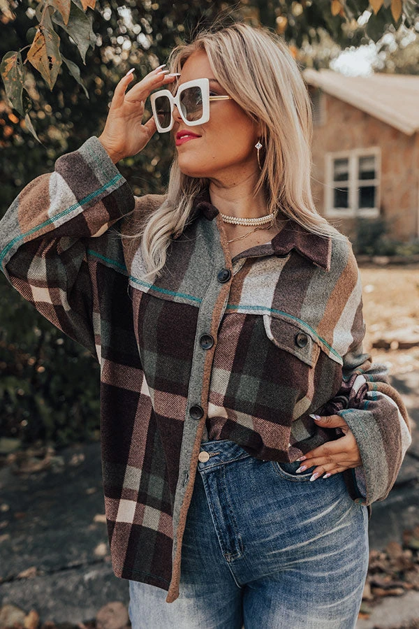 Stay cozy in the crunching leaves in this must-have jacket! Features ultra soft chestnut colored material with ivory, green, brown, and gray hued striped and plaid patterns, collared neckline that goes into a button down front, with a faux pocket accent flap, hidden side pockets, and a relaxed silhouette that falls into a slightly rounded hemline.