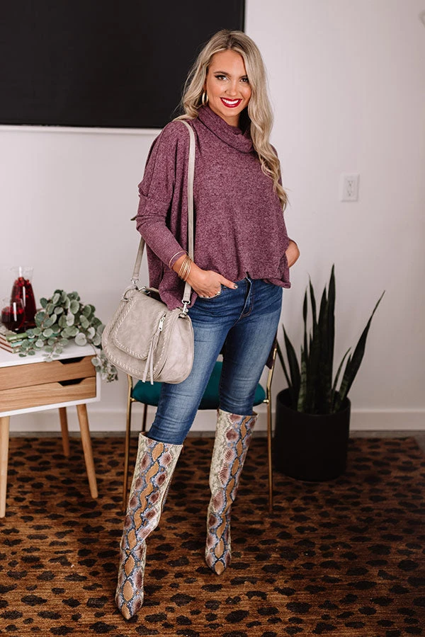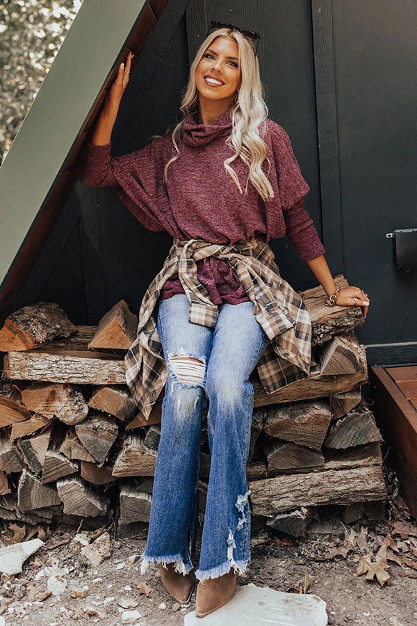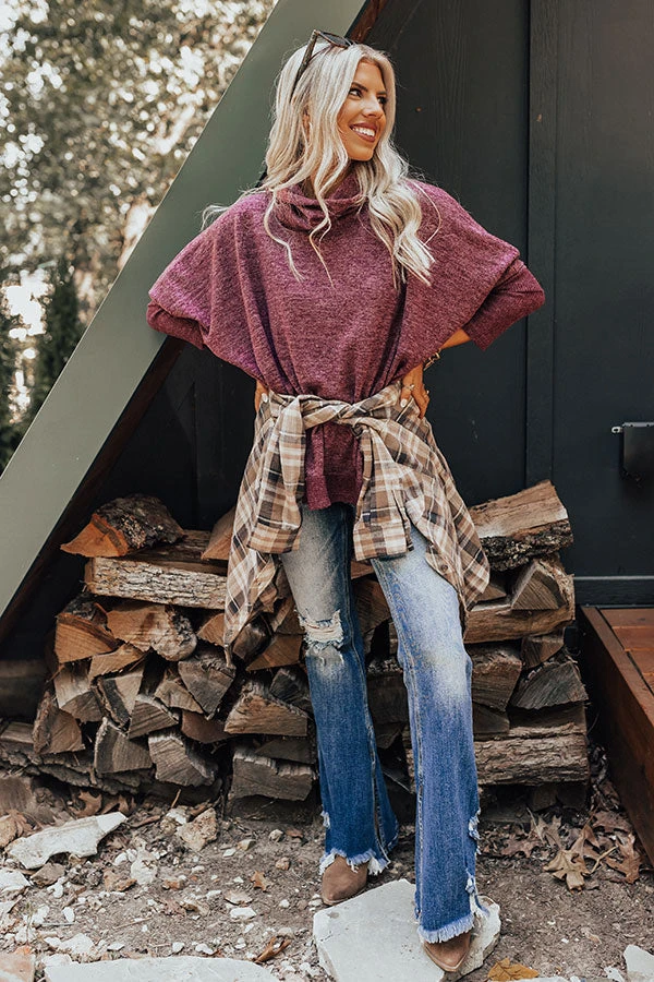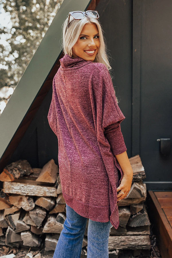 Keep you winter style casual but cute with our royal plum colored ‘Senorita Snuggles Shift Sweater’ featuring soft lightweight material, a bunched turtle neckline, long loose sleeves with fitted forearm cuffs, and an ultra draped silhouette that falls into a straight high/low tunic-length hemline with accent side slits!