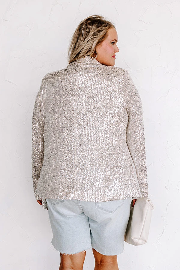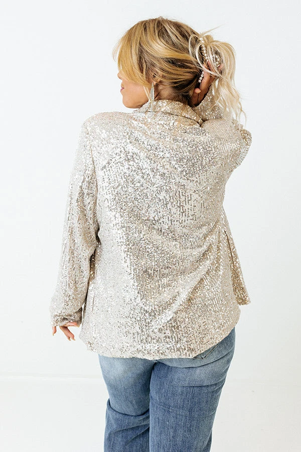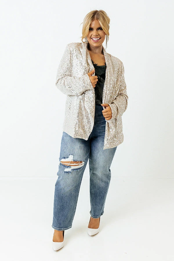 Complete your glamorous look with this stunning champagne blazer with shimmering sequins! Features an open front, a draped collared neckline, long sleeves with padded shoulders, and a flattering silhouette that falls into a straight hemline.