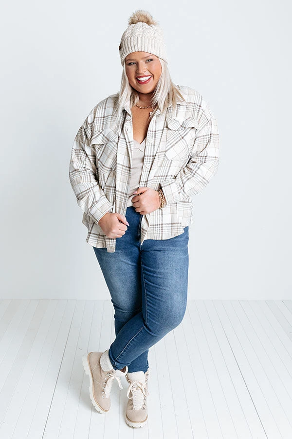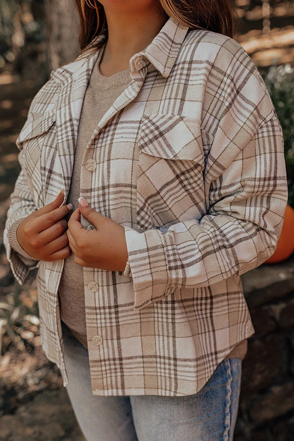 Stay gourd-geous all fall long with this darling plus size light birch colored jacket featuring a natural/grey hued plaid print, a button down front with a collared neckline, long loose sleeves with button closure cuffs, two accent chest pockets with flap closures, and a relaxed silhouette that falls into a rounded hemline!