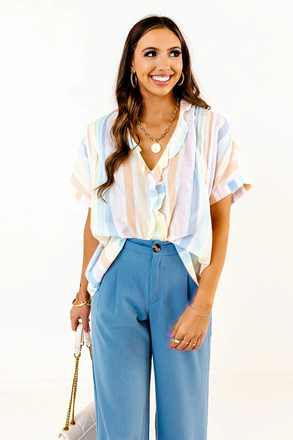 “Stripe” a pose in this charming shift top featuring lightweight material patterned with subtle vertical pastel stripes, a v-cut neckline with ruffle trim detailing that continues down the center, short loose sleeves, and a relaxed silhouette that falls into a straight hemline!