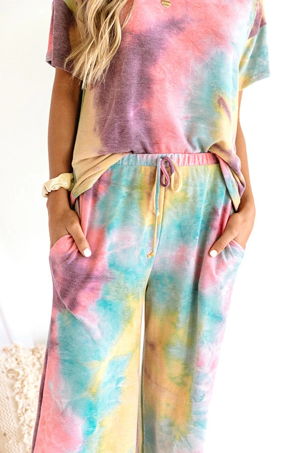 You will feel like you are relaxing on a cloud when you wear our adorable “Tender Heart” pants featuring ultra soft lightweight material patterned with golden honey, blue, and pink hued tie dye, an elastic waistline with a tie closure, accent side pockets, and a relaxed silhouette that falls into straight ankle-length hemlines! This comfy piece styles perfectly with our matching “Tender Heart Tie Dye Shift Tee in Golden Honey,” a scrunchie, and some fuzzy slippers for the ultimate two-piece lounge look!