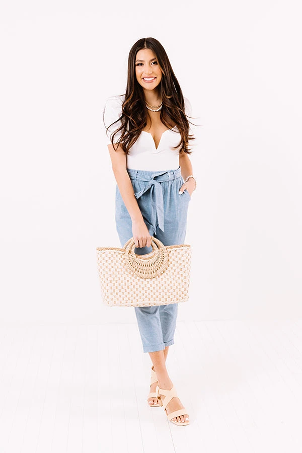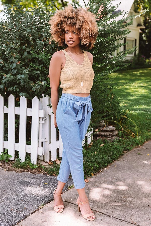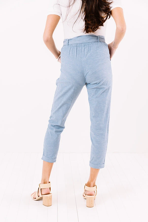 Diversify your wardrobe with our chic chambray ‘Celia’ trousers featuring sleek lightweight material, a high elastic waistline with belt loops and a tie belt, accent side pockets, and a relaxed figure flattering silhouette that falls into straight ankle-length cuffed hemlines!