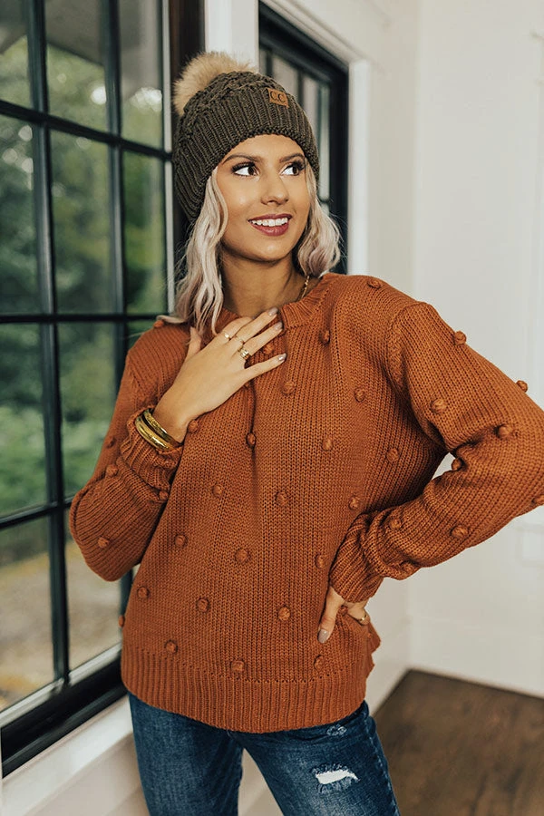 Get ready for sweater weather with our adorable rust colored ‘Undercover Sweetness’ top featuring ultra sot lightweight tight knit material with pom pom accents, a high rounded neckline, long loose sleeves with fitted cuffs, ribbed trim detailing, and a relaxed silhouette that falls into a straight hemline!