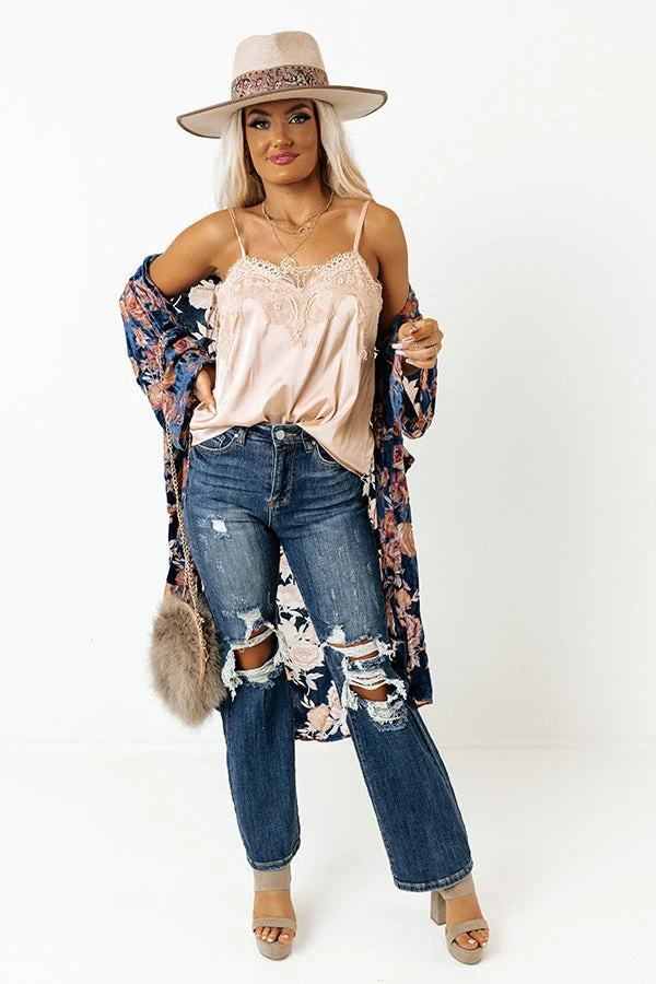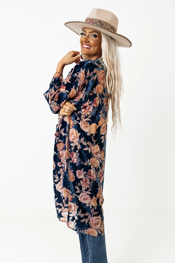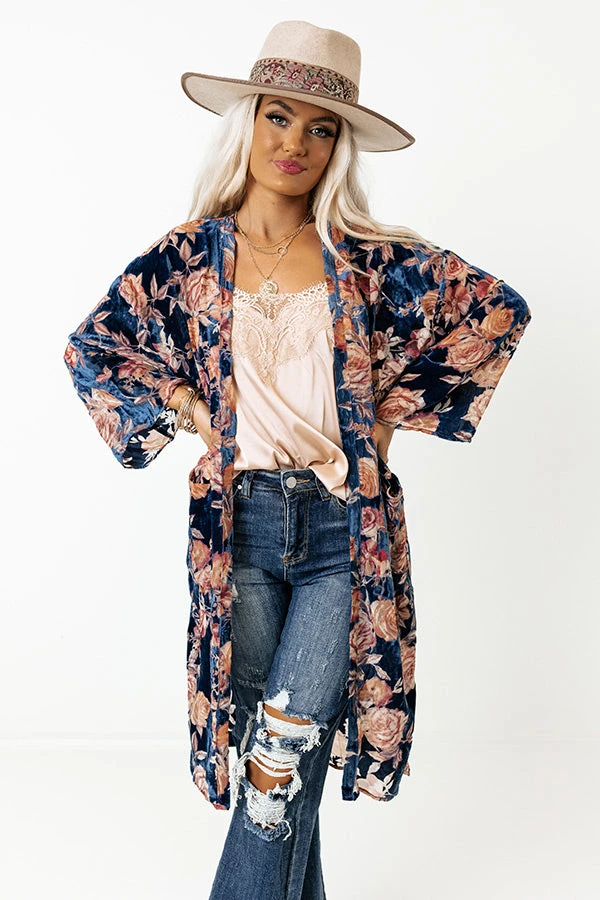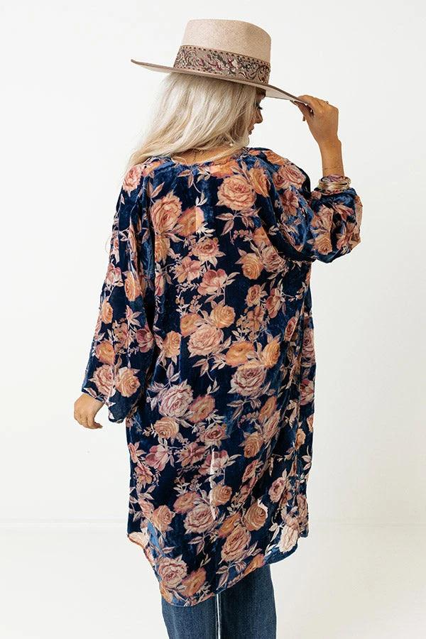 Our beautiful ‘Velvet Happiness’ top will be sure to bring smile to your face! Features lapis blue and pink chiffon and velvet materials, loose three-quarter length sleeves, side pockets, open draped silhouette that falls to straight knee length hemline.