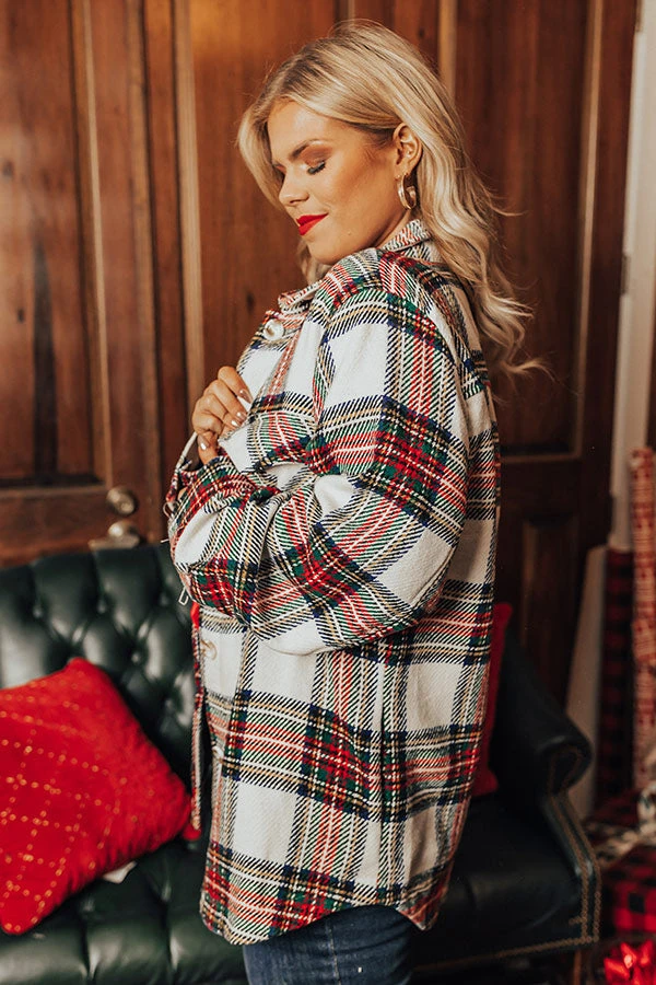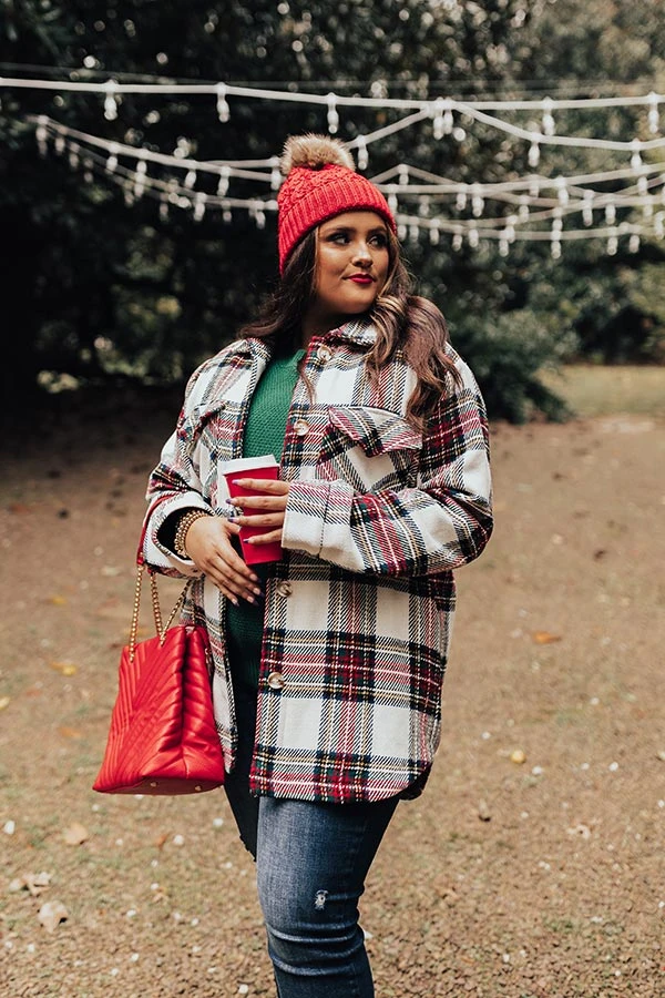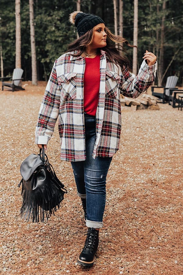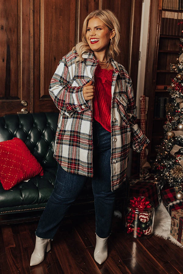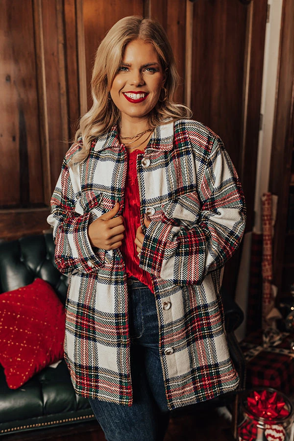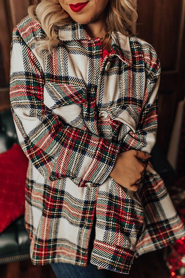 Whether you are Christmas shopping or playing in the snow, our adorable ‘Winter Rush’ jacket is perfect for it all! It features soft material patterned with a large red, black, and white plaid print, long loose sleeves, a button down front with a collared neckline, accent chest pockets with flap closures, and a relaxed silhouette that falls into a rounded mid-thigh length hemline!