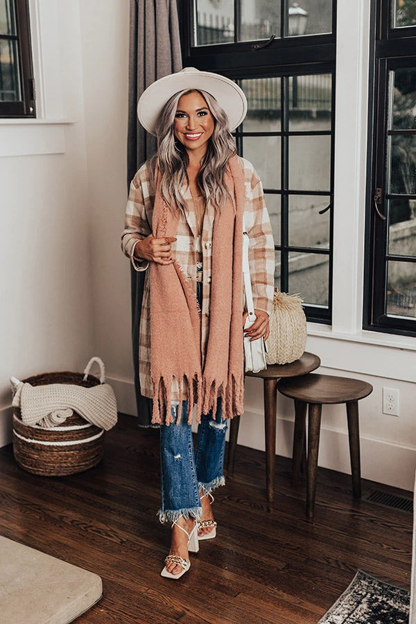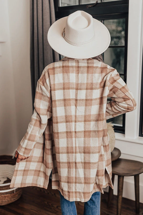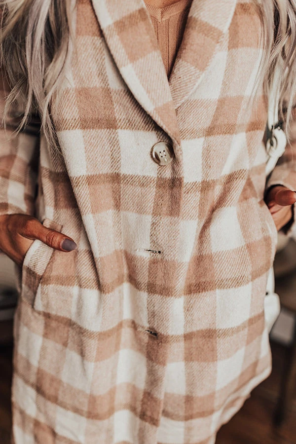 There is no better piece to keep warm with when it flurries than this beautiful coat featuring warm material patterned with a white and natural/pink hued buffalo check print, a button up front with a collared neckline, long loose sleeves, low side pockets, and a relaxed silhouette that falls into a straight mid-thigh length hemline!