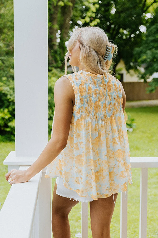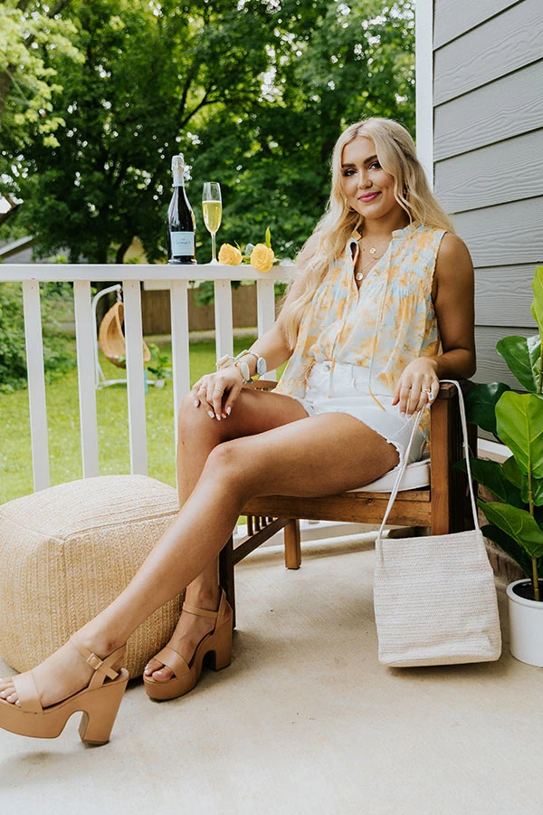 You deserve flowers and a new addition to your wardrobe…and we have the perfect piece! This adorable light blue hued shift top features lightweight breezy material patterned with a golden honey colored floral print, a v-cut neckline with a subtle ruffled tie closure collar, wide sleeveless shoulder straps, and a relaxed silhouette that falls into a rounded hemline!